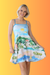 The Siesta Strappy Mini Dress comes in the Cabana Bay Print. Super fun and colourful with holiday inspired graphics, Palm trees, sunshine, waves! Has a baby blue trim along bust and adjustable spaghetti straps